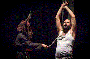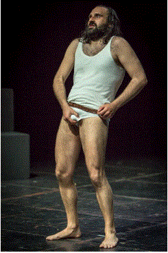 impazzire del nonsense. L’animale appare guitto, reietto, avanzo di galera come scrive Sabetti, mostro dissennato, aizzato, masochista; con Di Consoli satiro da sottosuolo, scemo di paese, aruspice, mutilato di guerra, reduce affamato, eccitato, profeta di morte, folle dilaniato dalla rabbia e dalla dolcezza di nullità cercata ostinatamente. Si bea oscenamente ed istintivamente della propria e generale irrilevanza, deforme presenza. Null’altro ha, Vicidomini, se non il proprio genio, tuttavia null’altro disprezza, Vicidomini, se non il proprio genio. Le maschere, Scapezzo, Veni Vici Domini e Fauno, sono fisicamente e igienicamente ributtanti, stolide, sguaiate, sudate, unte. Sono animali che non possono badare alla disintegrazione sociale in corso. Il pubblico fa dipendere il disagio dal gramelot campano; in realtà lo ha già dentro. A Gioia Tauro gli spettatori sono andati a protestare al Comune contro Vicidomini per averli terrorizzati e scioccati come un Golem, che si strizza i genitali, fatto con la merda al posto della terra.