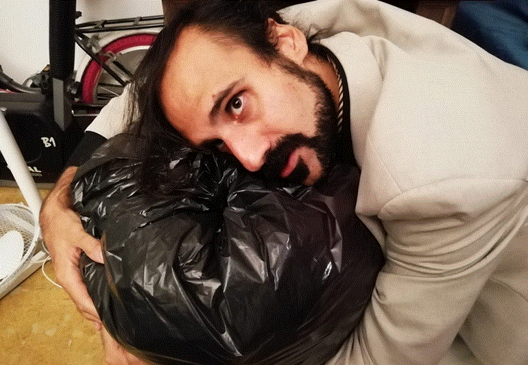 Non è che debba ragionarci sopra. Vicidomini fa. Non si sa bene cosa, ma fa. Ascolta Musica per chiavare; fa rumore, urla, versi e gestacci; cachinicchia con pernacchi eduardiani, attaccato all’ancora di salvezza della bustona di plastica grossa, come topi e gabbiani. La felicità può essere una busta di plastica senza buchi, dal film Shakespeare a colazione. Nella plastica, condannata per immorale inquinamento, stanno grottesca dolorosa maceria, memoria, speranza di tragicità estrema, autodistruzione ed autodeturpazione volontaria. L’animale attenta all’antropocentrismo con il fallimento ed il collasso di ogni senso. Come alcuni animali si nutre (ed adora) di feci, simboliche e non, proprie ed altrui.
