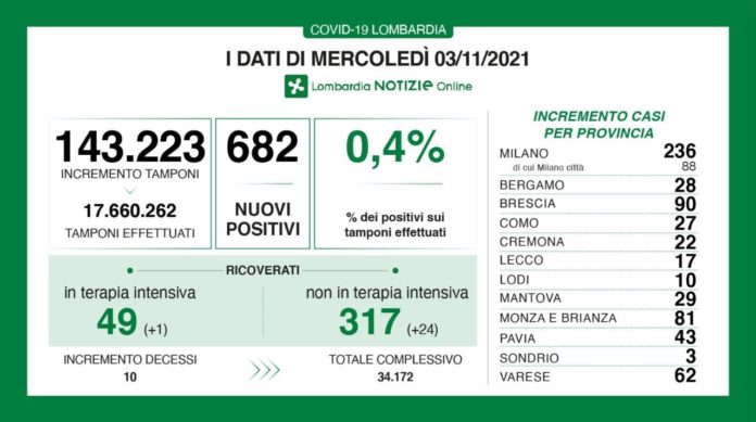 A fronte di 143.223 tamponi effettuati, sono stati 682 i nuovi positivi per un rapporto dello 0,4%. Lo ha riferito la Regione Lombardia nel bollettino Covid giornaliero.