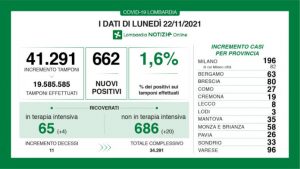 A fronte di 41.291 tamponi effettuati, sono stati 662 i nuovi positivi riscontrati in Regione Lombardia per un rapporto dell’1,6%. Si sono registrati 11 nuovi decessi.