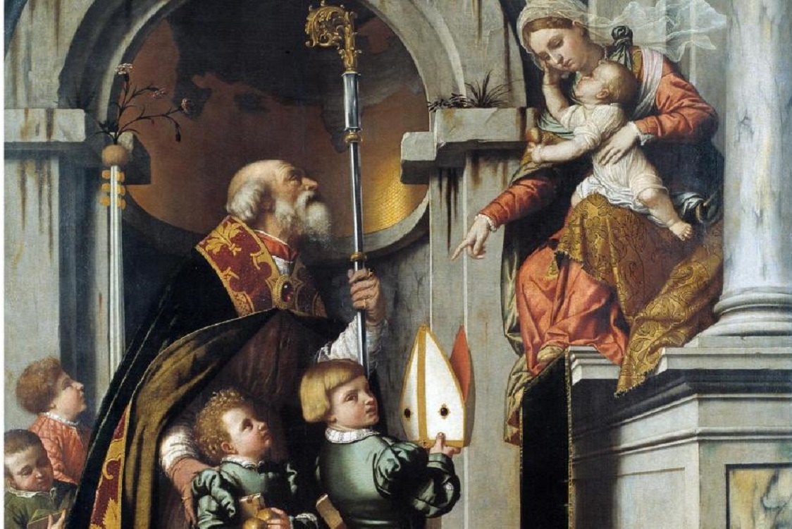 Il “San Nicola di Bari presenta gli allievi di Galeazzo Rovellio alla Madonna in trono con Bambino” è una delle due opere provenienti dalla Pinacoteca Tosio Martinengo di Brescia, dipinta da Alessandro Bonvicino detto il Moretto per la chiesa bresciana di Santa Maria dei Miracoli, nel 1539. Ambientato in una cornice architettonica classicheggiante, il quadro raffigura san Nicola di Bari che presenta alla Madonna in trono con il Bambino gli allievi del maestro di grammatica bresciano Galeazzo Rovellio, committente della pala. San Nicola si rivolge trepidante alla Vergine, per invocare la sua protezione sugli scolari. A sua volta la Madonna cerca di portare l’attenzione su questi ultimi del piccolo Gesù, che però non sembra volere staccare lo sguardo da lei. I quattro bambini recano la mitria vescovile di Nicola e i simboli dei miracoli del santo, tra cui le tre sfere d’oro, ma tengono anche sottobraccio e nelle mani i loro libri di scuola. La scena devozionale viene così ad arricchirsi di un preciso rimando al reale contesto che promosse la realizzazione dell’opera: quella di una scuola bresciana del tempo, con i suoi giovani studenti raffigurati in eleganti abiti contemporanei.