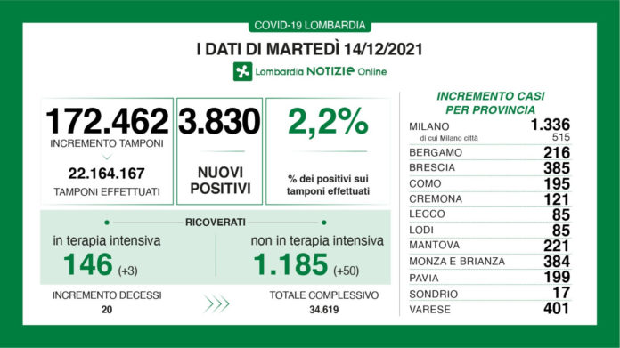 A fronte di 172.462 tamponi effettuati, sono stati 3.830 i nuovi positivi riscontrati in Lombardia, per un rapporto del 2,2%.