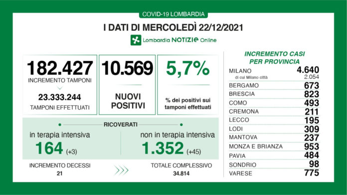 A fronte di 182.427 tamponi effettuati in Lombardia, sono stati 10.569 i nuovi positivi riscontrati per un rapporto del 5,7%.
