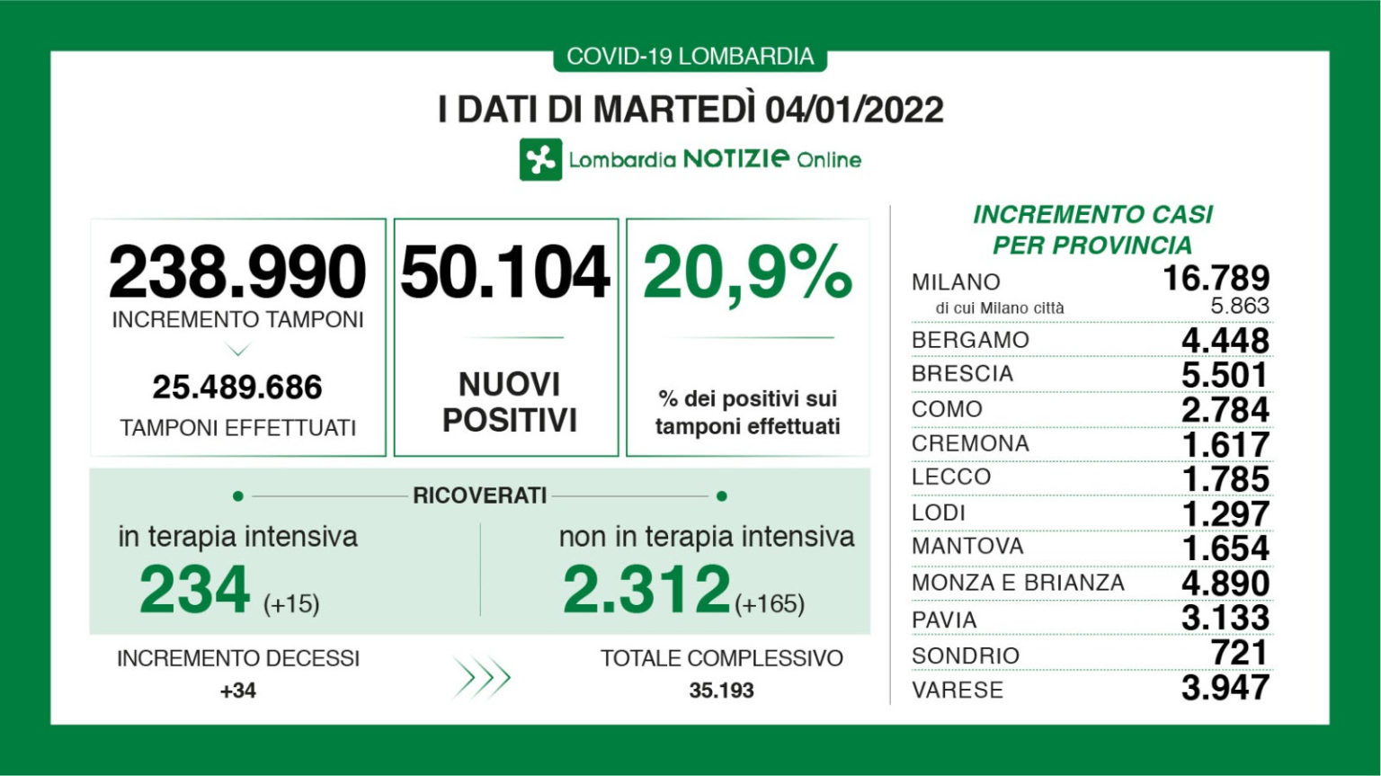 A fronte di 238.990 tamponi effettuati, sono 50.104 i nuovi positivi registrati in Lombardia, per un rapporto del 20,9%.