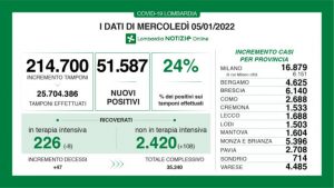 A fronte di 214.700 tamponi effettuati, sono stati 51.587 i nuovi casi risultati positivi in Lombardia, per un rapporto del 24%.
