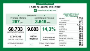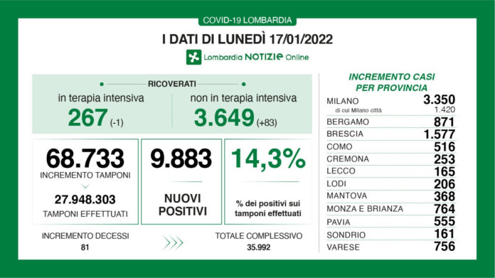 A fronte di 68.733 tamponi effettuati, sono 9.883 i nuovi casi risultati positivi ieri in Lombardia, per un rapporto del 14,3%. Lo riferisce la Regione Lombardia nel bollettino Covid giornaliero.