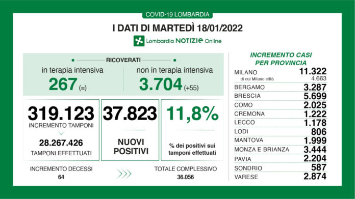 A fronte di 319.123 tamponi effettuati, sono 37.823 i nuovi casi risultati positivi in Lombardia per un rapporto dell’11,8%.