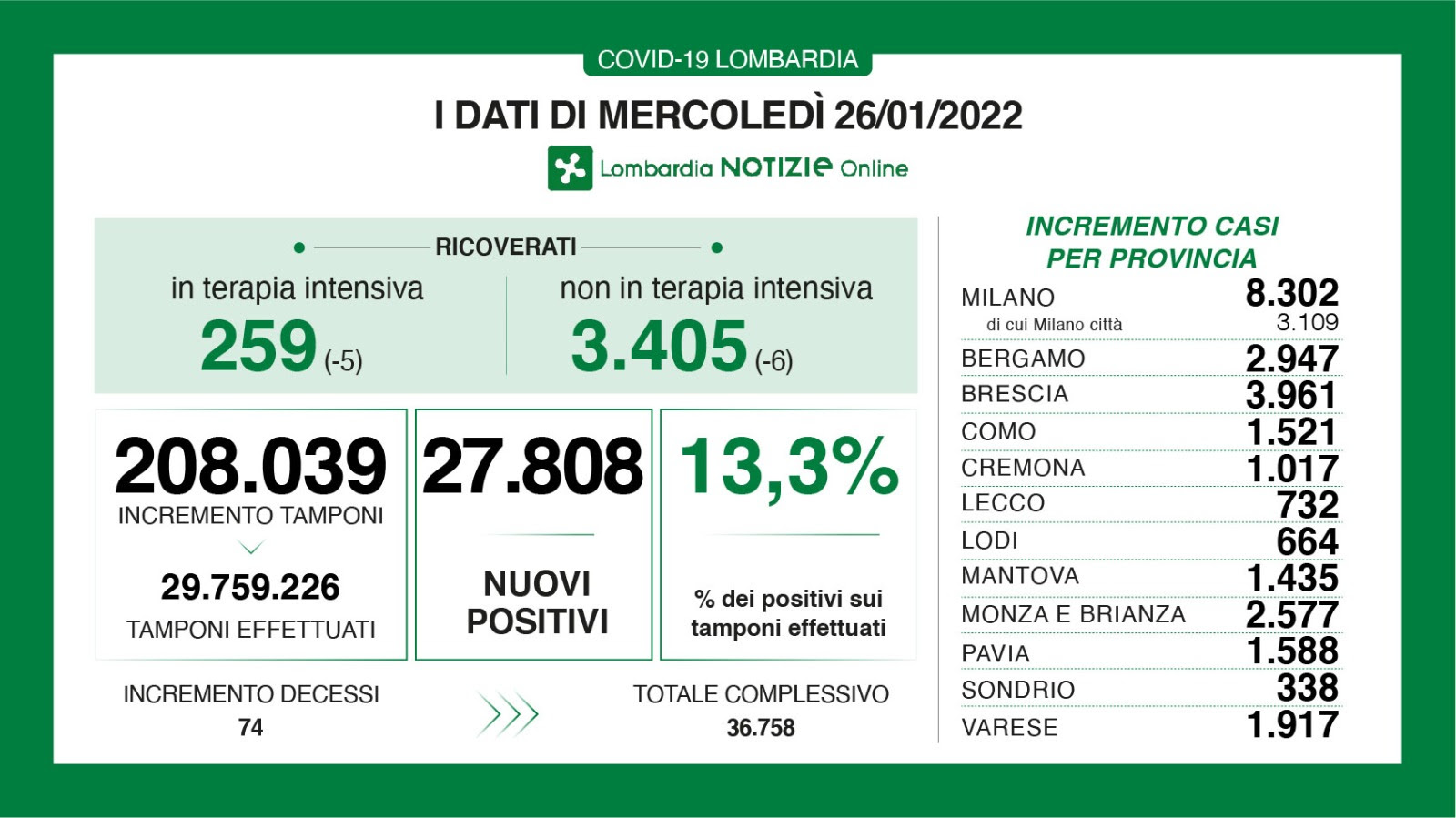 Con 208.039 tamponi effettuati, è di 27.808 il numero di nuovi positivi al Coronavirus registrati ieri in Lombardia, con una percentuale del 13,3% (ieri 11,2%).