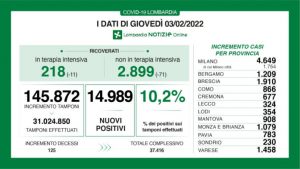 A fronte di 145.872 tamponi effettuati, sono 14.989 i nuovi casi risultati positivi in Lombardia, per un rapporto del 10,2%.