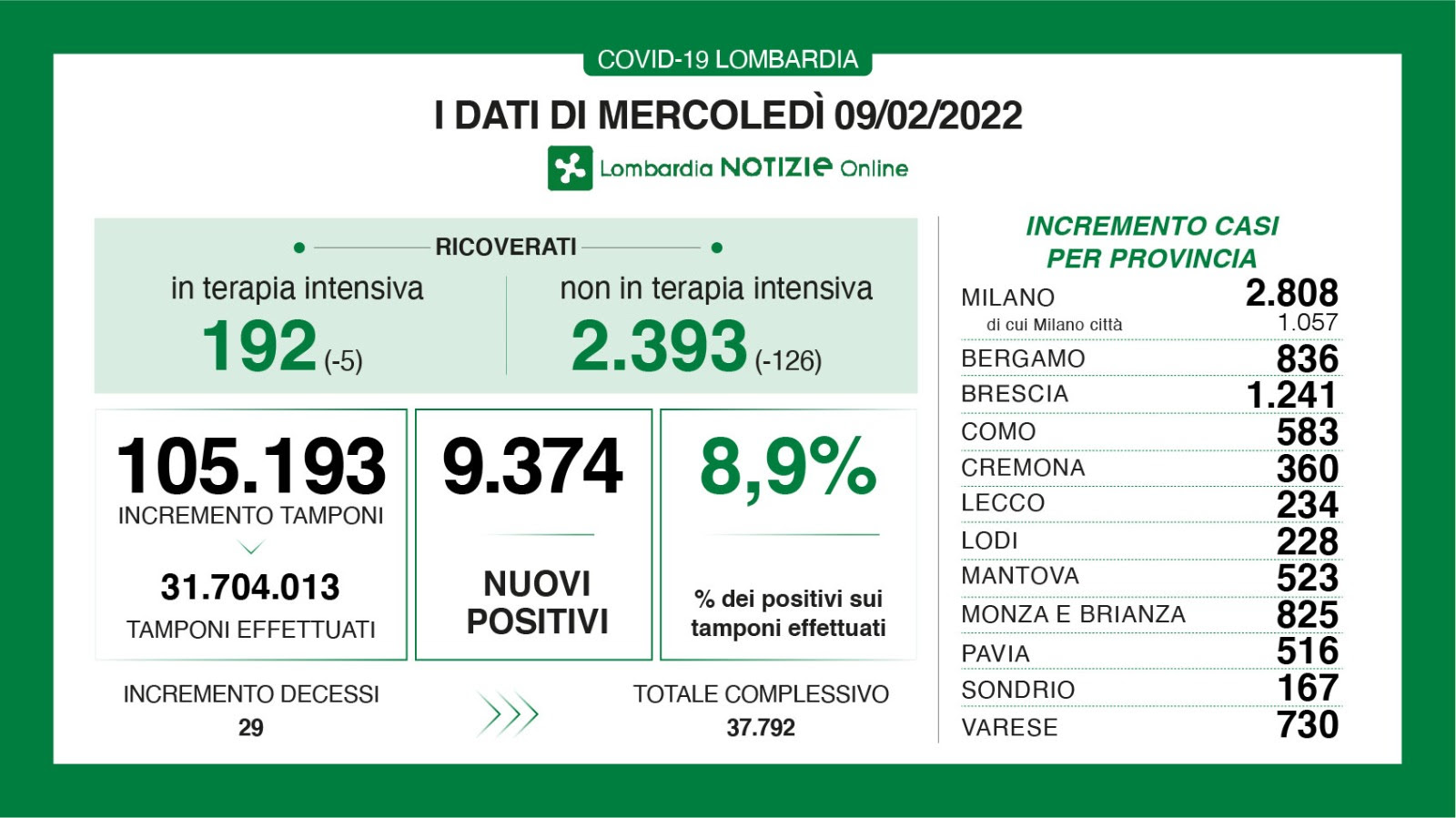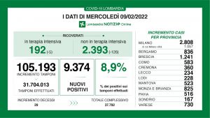 A fronte di 105.193 tamponi effettuati, in Lombardia sono 9.374 i nuovi positivi , per un rapporto dell’8,9%.