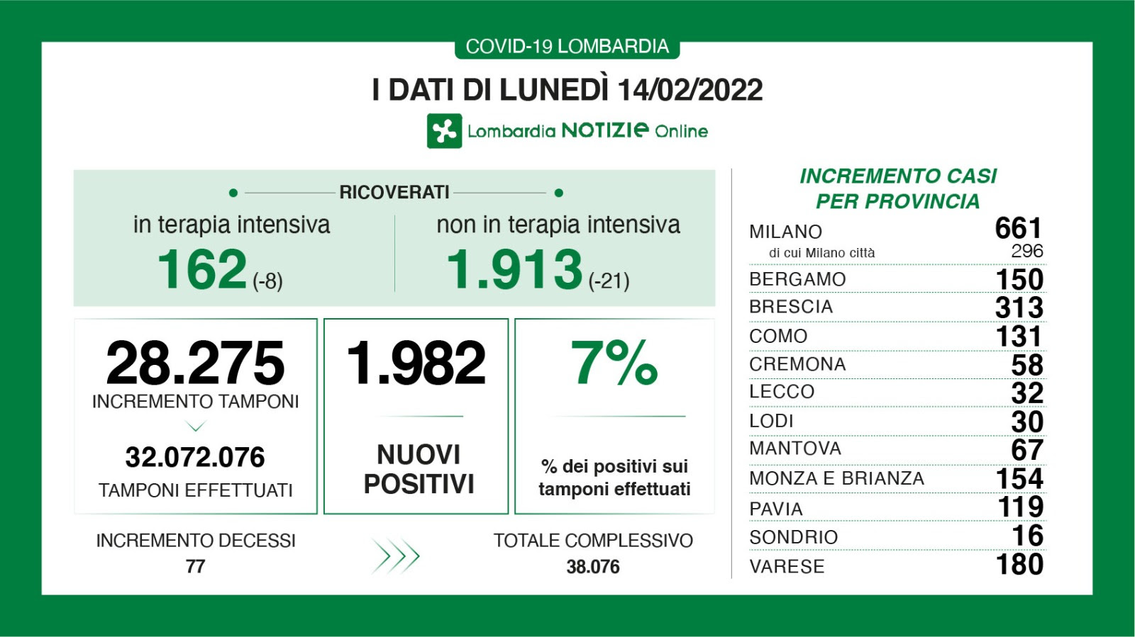 A fronte di 28.275 tamponi effettuati, sono 1.982 i nuovi positivi in Lombardia per un rapporto del 7%.