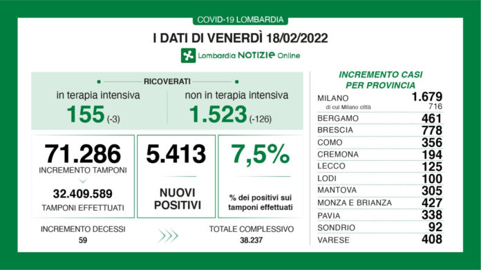 A fronte di 71.286 tamponi effettuati, sono 5.413 i nuovi positivi in Lombardia, per un rapporto del 7,5%.
