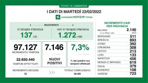 A fronte di 97.127 tamponi effettuati, sono 7.146 i nuovi positivi in Lombardia, per un rapporto del 7,3%.