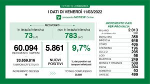 A fronte di 60.094 tamponi effettuati, sono 5.861 i nuovi positivi in Lombardia, per un rapporto del 9,7%.