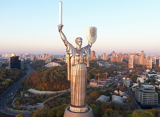 La statua della Madre Patria è un colossale monumento situato a Kiev, che simboleggia la madre patria. Fu inaugurata il 9 maggio 1981 da Leonid Il’ič Brežnev. Il monumento, progettato dallo scultore Yevgeny Vuchetich, è alto 102 metri, e la sola statua della Madre Patria 62 metri. La statua fu costruita come parte del Museo della Grande Guerra patriottica, dedicato alla guerra dell’Unione Sovietica contro la Germania nazista durante il secondo conflitto mondiale. La statua è costruita in titanio. L’intero monumento, compreso il basamento in calcestruzzo armato, pesa 560 tonnellate. La “Madre Patria” tiene al braccio destro una spada lunga 16 metri e pesante 9 tonnellate, e al braccio sinistro uno scudo che misura 13 per 8 metri, con lo stemma dell’Unione Sovietica. La punta della spada fu in seguito tagliata per evitare che il monumento superasse in altezza il monastero ortodosso di Pečerska Lavra. In una grande sala del Memoriale vi sono delle placche marmoree con incisi i nomi di oltre 11.600 soldati e oltre 200 operai del fronte sovietico, onorati col titolo di eroe dell’Unione Sovietica.