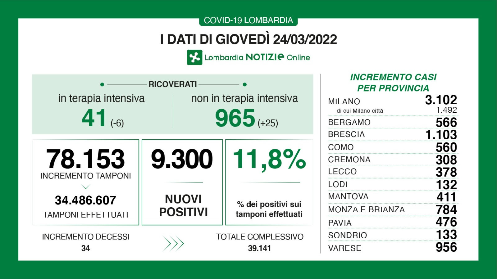 In Lombardia effettuati su 78.153 tamponi effettuati, si sono registrati 9.300 casi positivi per un rapporto dell’11,8%.