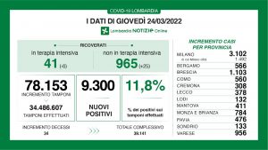 I ricoverati per covid in terapia intensiva sono 41 (-6), mentre quelli negli altri reparti sono 965 (+25).