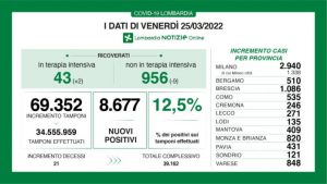 I ricoverati per covid in terapia intensiva sono 43 (+2), mentre quelli negli altri reparti sono 956 (-9).
