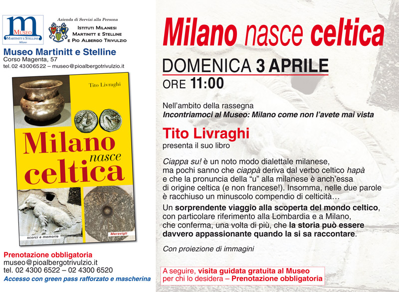 Domenica 3 Aprile – ore 11:00 – vi aspettiamo al Museo Martinitt e Stelline (corso Magenta 57) per un nuovo appuntamento del ciclo “Incontriamoci al Museo: Milano come non l’avete mai vista”: in compagnia del noto medico scrittore milanese Tito Livraghi andremo alla (ri)scoperta delle origini della città, prendendo spunto dal suo libro “Milano nasce celtica”