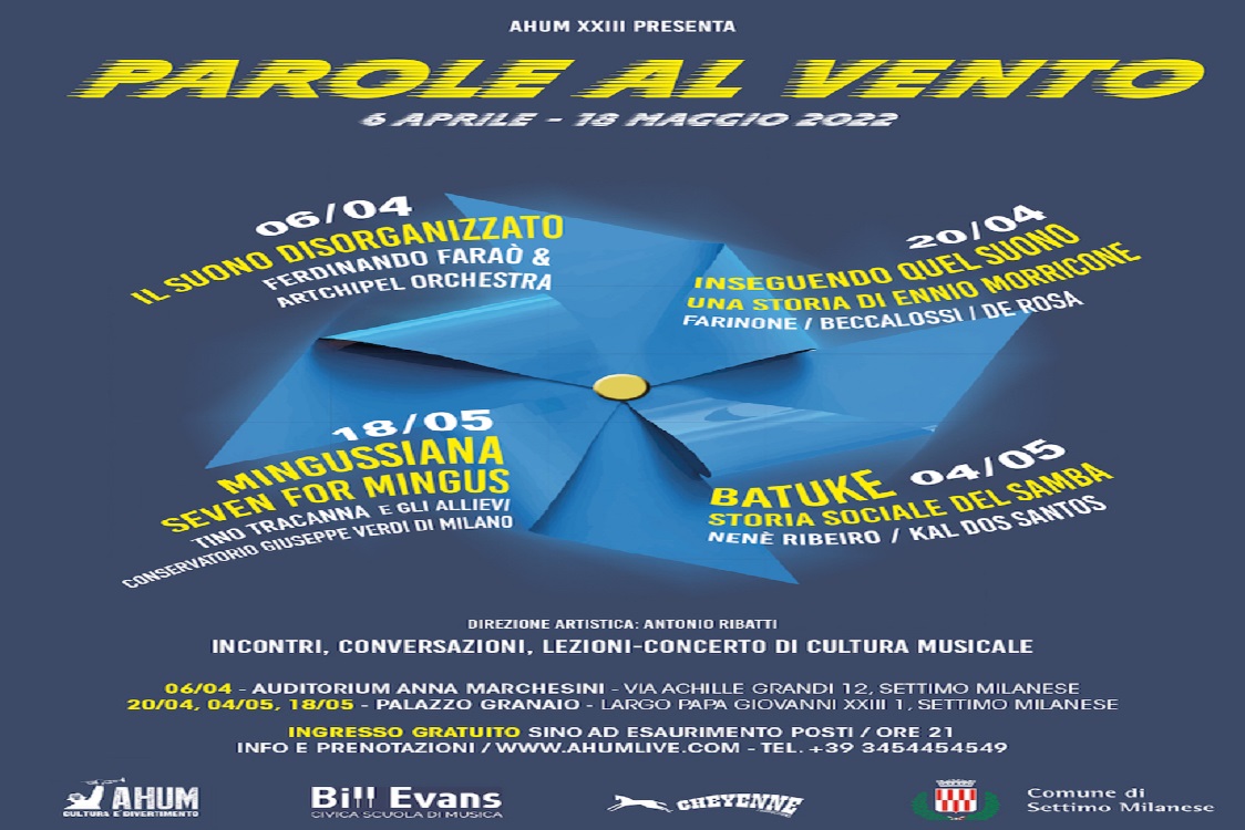 Mercoledì 4 maggio, sempre a Palazzo Granaio, sarà la volta di “Batuke: storia sociale del samba”, a cura dei musicisti brasiliani Nenè Ribeiro (chitarra e voce) e Kal dos Santos (percussioni e voce), con la partecipazione del laboratorio di percussioni Toc Toc. “Batuke” sarà una lezione-concerto che ripercorrerà la genesi e l’evoluzione del più originale e radicato ritmo brasiliano. Nella loro performance, Nenè Ribeiro e Kal dos Santos partiranno dall’origine del samba per mettere in risalto la sua valenza sociale e artistica e la sua peculiare espressione corporea. Racconteranno, quindi, la diffusione del samba nella città di Rio de Janeiro, nel resto del Brasile e successivamente nel mondo intero per poi dare spazio (e voce) ai principali interpreti e ai maggiori compositori di questo irresistibile genere musicale, come Sinhô, Ismael Silva, Cartola, Clementina de Jesus, Noel Rosa, Ary Barroso, Dorival Caymmi, Wilson Batista, Zé Kéti, Baden Powell, Paulinho da Viola e Chico Buarque, solo per citarne alcuni. Anche in occasione di questo incontro, testi, spartiti, foto e illustrazioni guideranno il pubblico attraverso la musica e il racconto. La nuova stagione di “Parole al vento” si concluderà mercoledì 18 maggio con “Mingussiana: Seven for Mingus”, progetto ideato in occasione del centenario della nascita di Charles Mingus, uno dei più importanti jazzisti di tutti i tempi. Gli renderanno un doveroso omaggio il sassofonista Tino Tracanna, nome di spicco della scena italiana, e il suo gruppo, formato da alcuni dei più brillanti studenti del Conservatorio Giuseppe Verdi di Milano e ribattezzato, per l’appunto, Seven for Mingus. Tra gli anni Cinquanta e Sessanta Mingus elaborò una formidabile sintesi musicale tra la grande tradizione del jazz e i nuovi linguaggi che in quel momento stavano esplodendo, recuperando l’improvvisazione collettiva e riproponendola nell’ambito formale delle sue meravigliose composizioni, fertile terreno per i suoi collaboratori e formidabili solisti che, come lui, si muovevano con disinvoltura tra tradizione e avanguardia. Il settetto diretto da Tino Tracanna al sax tenore (con Cecilia Barra, voce; Daniele Nocella, tromba; Giacomo Cazzaro, sax alto; Claudio Guarcello, pianoforte; Cristiano Nuovo, contrabbasso; Elia Ambrosioni, batteria) interpreterà alcune delle più belle composizioni del contrabbassista afroamericano, rispettandone l’impianto formale ma riproponendole secondo la propria personalità musicale e il proprio linguaggio improvvisativo, nel rispetto della vocazione fondante della musica di Mingus.