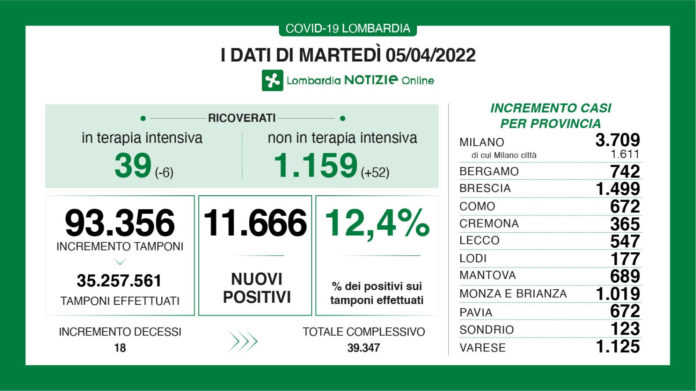 A fronte di 93.356 tamponi effettuati, sono 11.666 i nuovi positivi (12,4%). Lo riferisce la Regione Lombardia nel bollettino Covid giornaliero. I ricoverati in terapia intensiva sono 39 (-6). I ricoverati non in terapia intensiva sono 1.159 (+52). Si registrano 18 nuovi decessi. A Milano e provincia i nuovi casi sono 3.709 di cui 1.611 a Milano città.