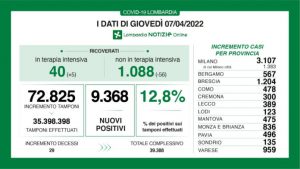 A fronte di 72.825 tamponi effettuati, sono 9.368 i nuovi positivi in Lombardia per un rapporto del 12,8%.