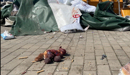 “Ho sentito due gigantesche esplosioni in aria. Le macchine davanti a me hanno preso fuoco e poi il buio” racconta Daria, che ha delle schegge in un braccio. Le strisce di sangue della strage alla stazione continuano fino alla sala d’attesa, dove tutto è in frantumi. Un cane azzoppato sembra fare la guardia a delle chiazze rosse sul marmo, forse il sangue del suo padrone.