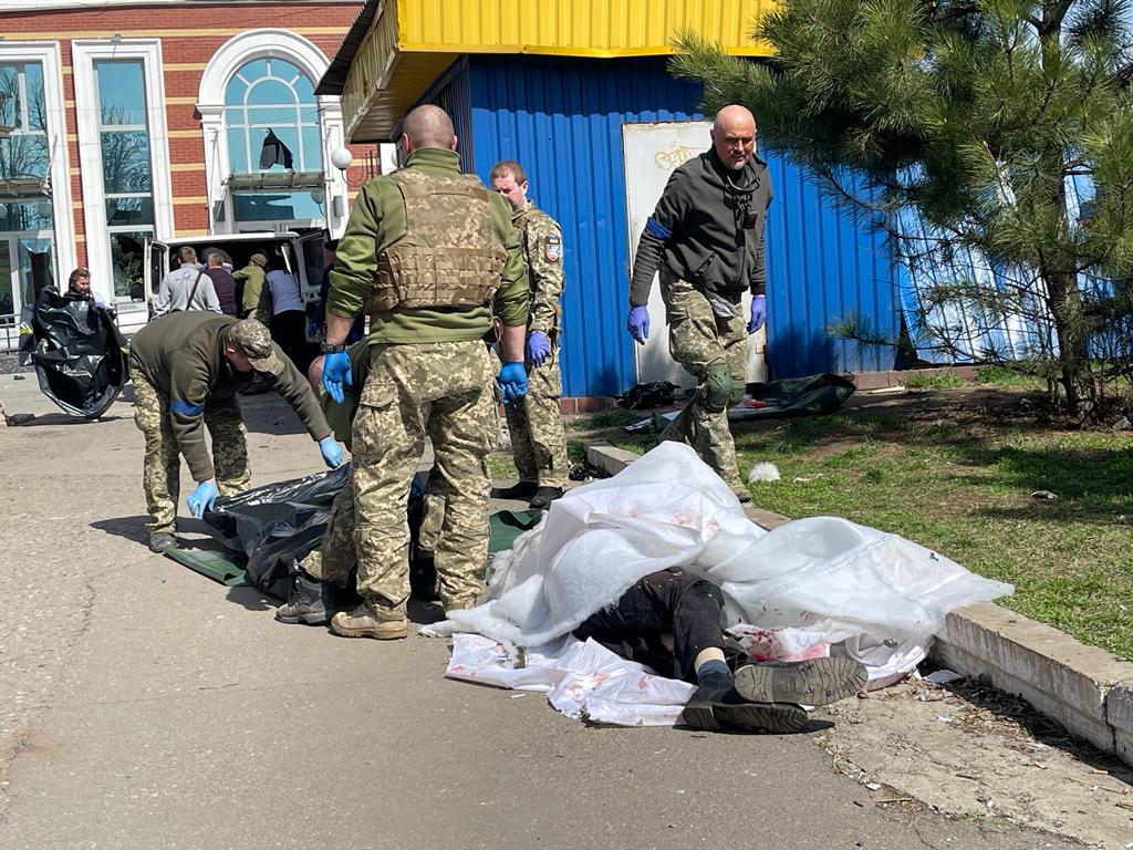 rattrappita di un’anziana sbuca da sotto un telo. I militari con il simbolo della croce rossa sul braccio arrivano con i sacchi neri per portare via i corpi. Quando alzano i teli vedi tutta la brutalità della guerra che falcia i civili. E’ la strage degli innocenti, della gente in fuga, soprattutto donne e bambini, che agognavano un posto sul treno della salvezza. Nella stazione di Kramatorsk hanno trovato la morte.