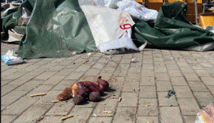 L’orrore è coperto da teli verdi e bianchi che sono diventati rossi. Due lunghe file di corpi allineati da militari e poliziotti, con lo sguardo vitreo, che non dicono una parola. Da un telo spunta la gamba affusolata di una donna, dall’altra il corpo di una ragazzina. Un bambino è stato decapitato dalla furia dell’esplosione. La mano biancastra e