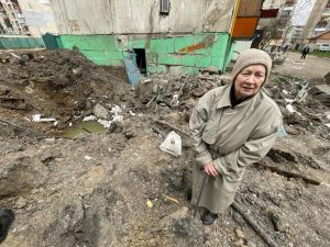 Una possente colonna di fumo nero si alza in mezzo alle case. Il cortile di un’abitazione è stato centrato da un missile Grad, che ha incenerito l’automobile parcheggiata e tutto quello che stava attorno. Una signora piangente esce di corsa da casa per dire: “Sono terrorizzata. Mio marito combatte e non riesco a mettermi in contatto con lui. Ho i bambini e non so cosa fare”. Il centro dei volontari che distribuiscono generi di prima necessità è sommerso dagli scatoloni arrivati da tutta Europa compreso uno della nostra Protezione civile. I volontari confermano che “riceviamo aiuti e medicinali anche dall’Italia”. Un trio di arditi ragazzini ci porta nel cortile di alcune case popolari dove si è aperto un enorme cratere. “Ho sentito il rumore di un aereo, che ha sganciato una bomba con il paracadute combinando questo disastro” racconta Lidia, che cammina con l’aiuto del bastone. Non si capisce quale fosse l’obiettivo.