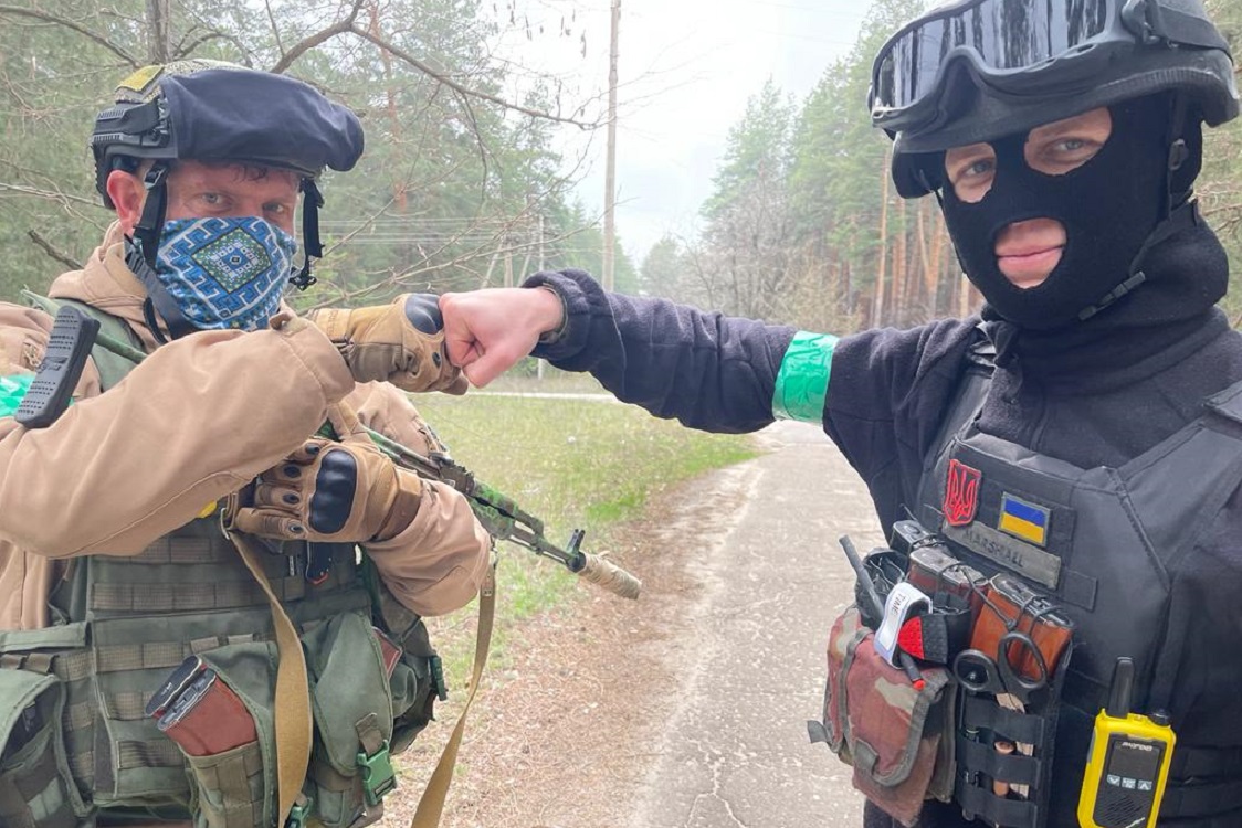 La difesa territoriale è composta da volontari con esperienza militare mescolati in maniera eterogenea. Rebalkin ci porta in mezzo alla foresta nel centro del fronte del Donbass. Un tempo oasi di pace disseminato di resort frequentati dai turisti. L’unità è composta da giovani muscolosi con il volto coperto dai passamontagna e veterani dai capelli grigi che hanno servito nell’Armata rossa ai tempi dell’Unione sovietica. Gli ordini sono di pattugliare i boschi e rastrellare i resort per controllare «che gli edifici abbandonati non vengano usati come basi di munizioni e provviste – spiega il comandante – dagli Spetnatz russi che si infiltrano dietro le linee per raccogliere informazioni e compiere sabotaggi». L’ambiente isolato è perfetto e gli echi cupi della cannonate ricordano quanto sia vicina la prima linea.