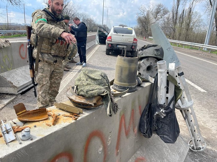 Sulla strada del ritorno verso Mykolaiv uno dei posti di blocco è trasformato in un mini museo dell’invasione all’aperto. Sui blocchi di cemento dove i soldati hanno scritto a caratteri cubitali “Kherson è Ucraina” sono appoggiati i reperti di guerra. Un razzo Smerch con la spoletta a tempo che porta in grembo le bombe a grappolo. L’elmetto di un soldato di Mosca sfondato, la borsa nera con la stella e la scritta “esercito russo”. E un giubbotto antiproiettile verde mimetico: su una delle protezioni è riportato il nome di un fuciliere russo della 5° brigata motorizzata che lo indossava, M. Kagermanov.
