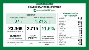 A fronte di 23.366 tamponi effettuati, sono 2.715 i nuovi positivi in Lombardia, per un rapporto dell’11,6 %.