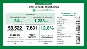 Con 59.522 tamponi effettuati è stato di 7.631 il numero di nuovi positivi registrati in Lombardia, con un tasso in discesa al 12,8%.