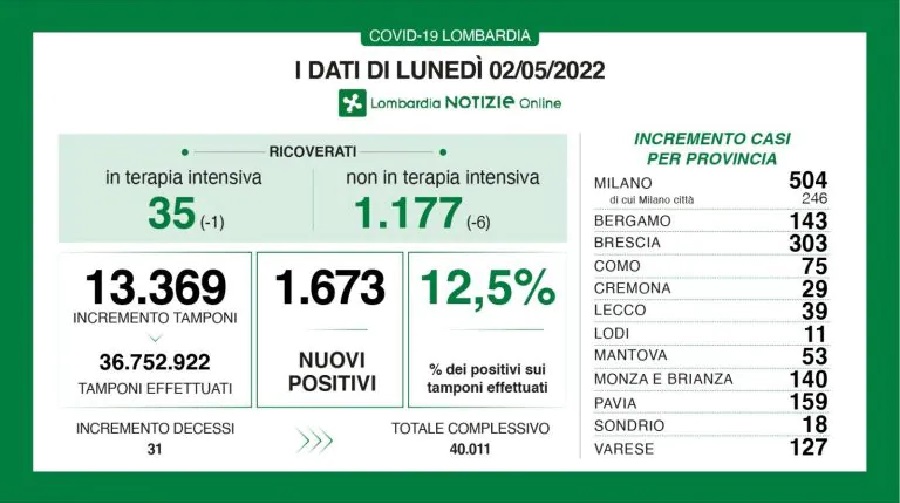 Si sono registrati 31 nuovi decessi. A Milano e provincia i nuovi casi sono 504 di cui 246 a Milano città.