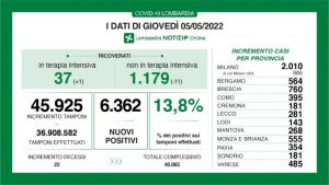 A fronte di 45.925 tamponi effettuati, sono 6.362 i nuovi positivi in Lombardia, per un rapporto del 13,8%.