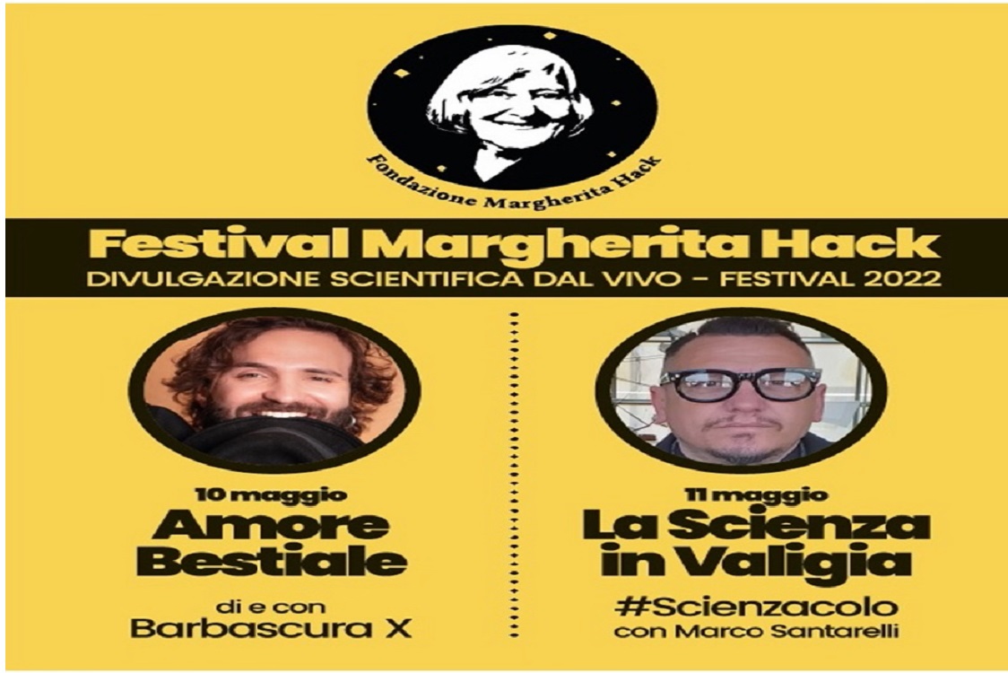 Il 10 Barbascura X presenterà ‘Amore bestiale’, un viaggio irriverente sui metodi di accoppiamento più bizzarri e scomodi del regno animale, mentre l’11 maggio andrà in scena ‘La Scienza in Valigia’, un progetto di divulgazione scientifica nato negli anni di collaborazione e amicizia tra Margherita Hack e Marco Santarelli, direttore generale della Fondazione Margherita Hack.