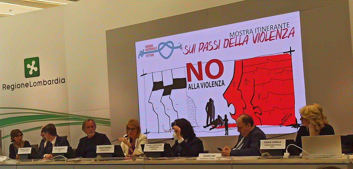 Rosso come il sangue versato, nero come le tenebre, bianco come l’innocenza, questi gli unici colori che Sergio Brambillasca ha utilizzato per rappresentare la violenza subita nelle quattordici opere, come 14 sono le stazioni della via Crucis, che compongono la mostra itinerante, inaugurata al Palazzo Pirelli, “Sui passi della violenza” organizzata da UNAVI Unione Nazionale Vittime. Prima del taglio del nastro ha avuto luogo, presso la Sala Gonfalone della sede del Consiglio Regionale della Lombardia, un convegno che ha coinvolto media, istituzioni e cittadinanza.