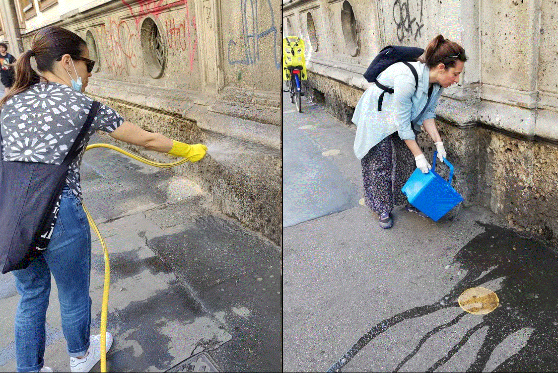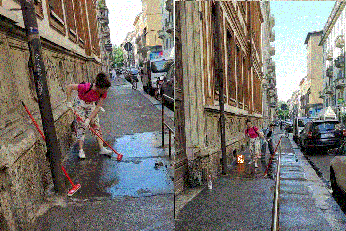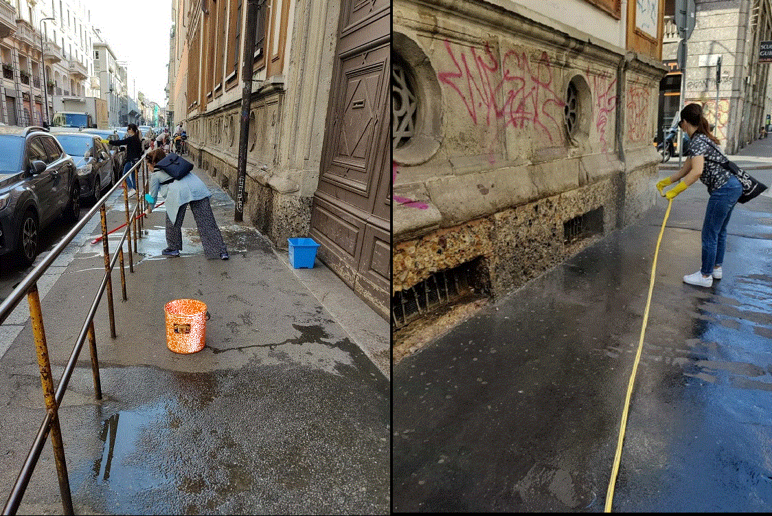 Nei giorni scorsi i genitori della primaria della Scuola Casati hanno organizzato un “Flash mob” e lavato con candeggina il marciapiede dopo averlo pulito da rifiuti (cocci di bottiglia, vuoti, plastiche, mozziconi di sigarette, lattine, ecc), molti dei quali annidati da anni nelle finestrelle e nelle sottostanti feritoie a livello strada.