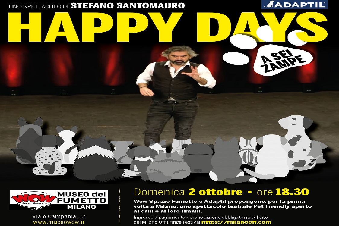 Questa vicinanza agli animali urbani ha spinto il museo a seguire il Milano off in un’avventura senza precedenti: aprire lo spettacolo teatrale a cani e umani. Ecco allora che in occasione dell’ultima giornata del Milano Off Fringe Festival (2 ottobre) e in concomitanza con la Giornata Mondiale degli animali (4 ottobre) Wow Spazio Fu metto e Adaptil propongono, per la prima volta a Milano, una giornata Pet Friendly con uno spettacolo teatrale aperto ai cani e ai loro umani. Grazie alla collaborazione di Adaptil sono stati messi a disposizione del binomio cane e umano 30 posti gratuiti per lo spettacolo Happy Days, scritto, diretto e interpretato da Stefano Santomauro.