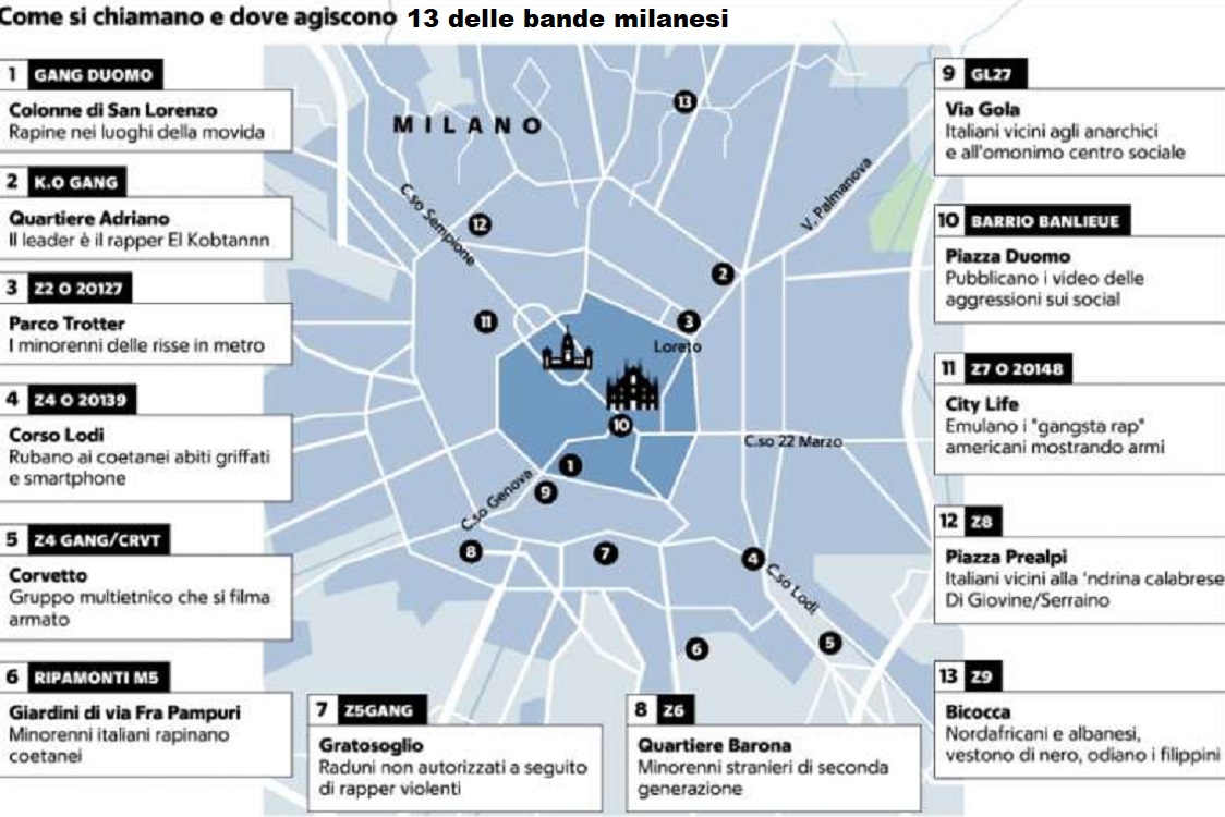 C’è la Gang di Ripamonti, la Z4, la banda K.0., o anche quelli che scelgono il nome del quartiere o il numero del codice di avviamento postale. Un modo per marcare il territorio, per dire qui. A via Padova, ad esempio, sono conosciuti come i “20127”. Sono alcune delle 16 baby gang che da mesi seminano terrore a Milano. I carabinieri della compagnia Duomo guidati dal Comandante Gabriele Lombardo sono riusciti a fotografare una mappa criminale di queste bande con l’aiuto della Procura per i minorenni. Hanno disegnato un identikit preciso di ogni gruppo, la loro composizione, i leader, le specialità, i nickname sui social. Chi sono. Come si muovono. Quartiere per quartiere. Dalla periferia al centro. Protagonisti di scorribande da una parte all’altra della città. Da piazza Mercanti alla Darsena, passando per le colonne di San Lorenzo fino a corso Como, zona della movida milanese. Girano in branco, cappucci neri, giubbotti firmati e hanno una caratteristica comune sono giovanissimi, molto spesso minorenni. Ogni pretesto è buono per scatenare una rissa. Basta un parola di troppo, un commento sbagliato.
