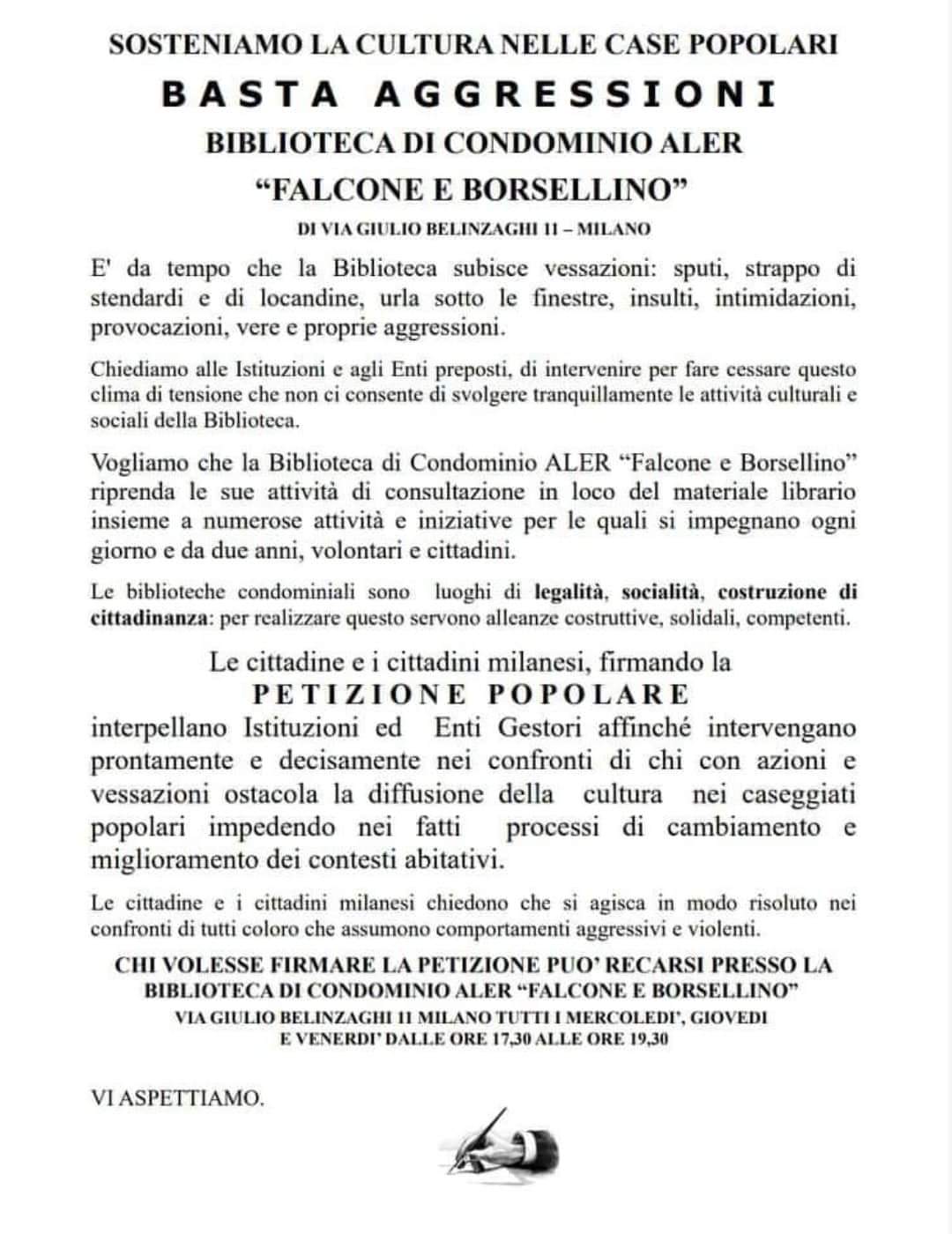 Sosteniamo la cultura nelle case popolari “Basta aggressioni” Biblioteca di condominio Aler “Falcone e Borsellino”