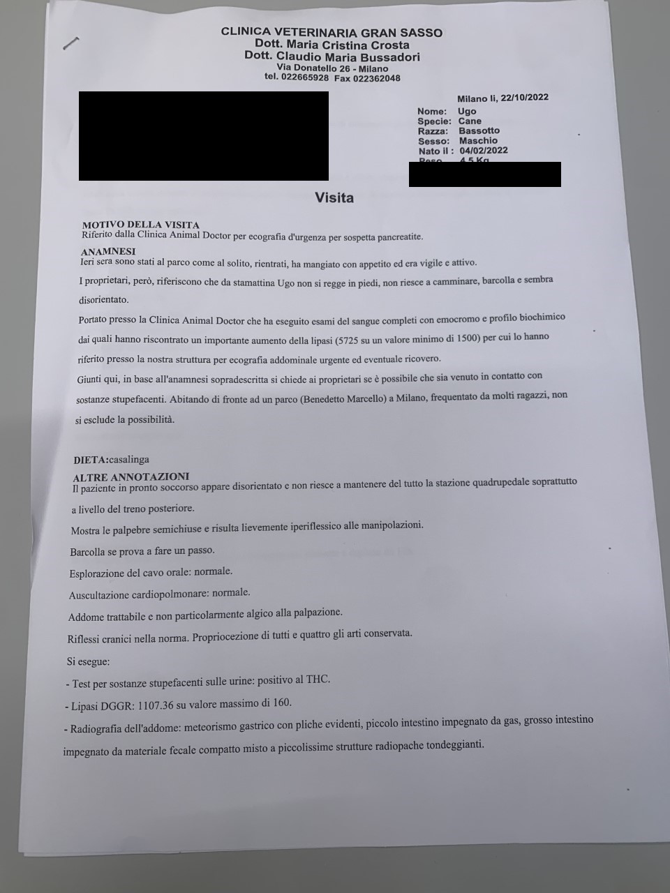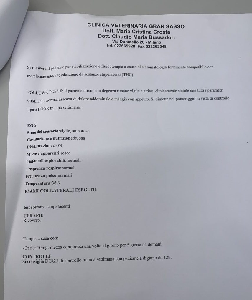 Accanto al degrado ora lo spaccio si sta diffondendo a tal punto che alcuni cani – allego referto ambulatorio veterinario – si sono sentiti male ingerendo marijuana (come da test tossicologici effettuati).