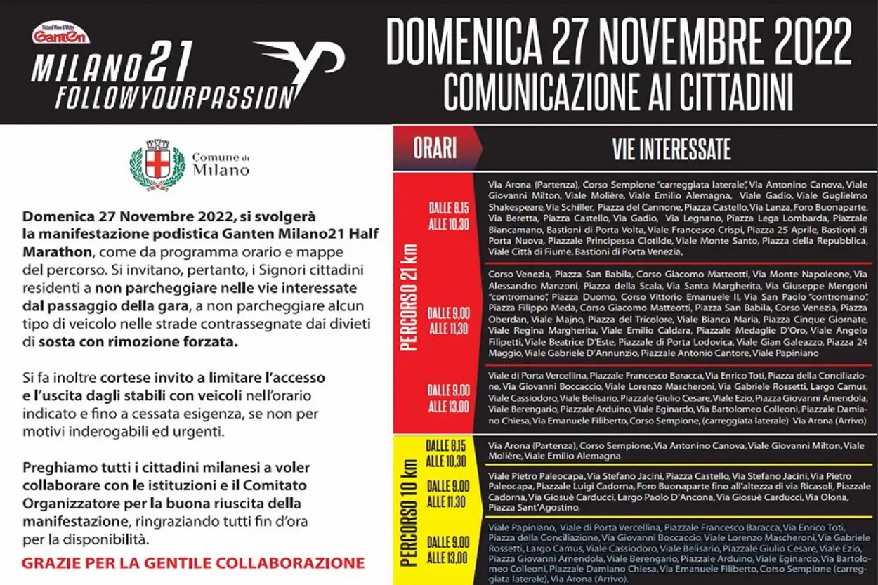 Oggi  si svolge la “Ganten Milano 21 Half Marathon” e il centro della città sarà invaso da migliaia di atleti che correranno sui tracciati dei due percorsi possibili: quello da 10chilometri -c on partenza da viale Papiniano e arrivo in via Arona – e quello da 21 chilometri, con partenza e arrivo in via Arona.