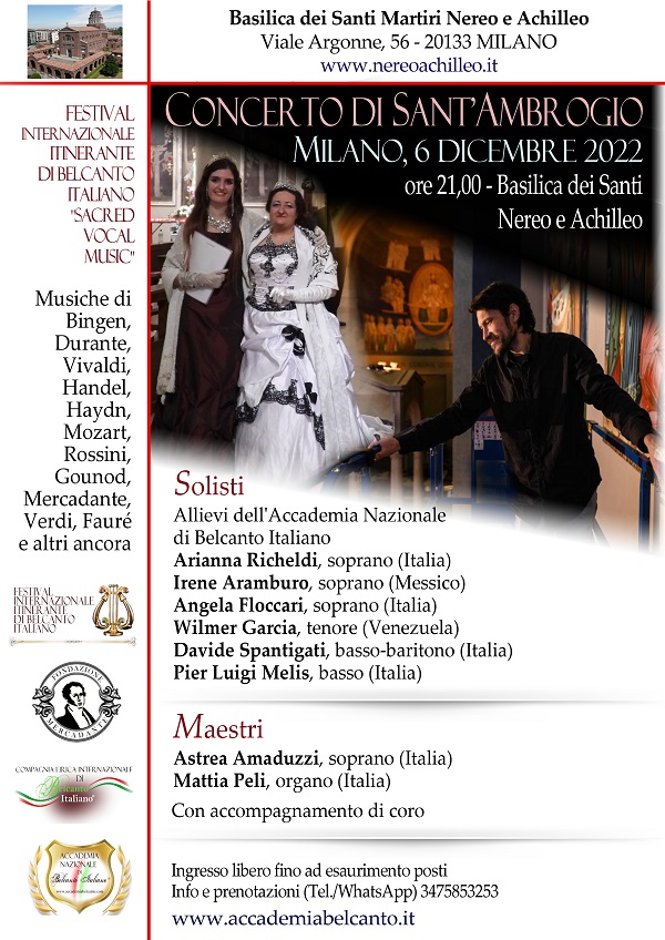A Milano, nella Basilica dei Santi Nereo e Achilleo, martedì 6 dicembre 2022, si avrà l’occasione di ascoltare, alle ore 21.00, un grande concerto internazionale: la serata musicale sarà dedicata principalmente ai capolavori della musica sacra del Sette e Ottocento, nelle ultime ore della giornata in cui tradizionalmente, secondo il calendario, si festeggia “San Nicola, vescovo di Mira”, e in prossimità del giorno dell’anno in cui si ricorda che, grazie ai milanesi, il 7 dicembre 374, Ambrogio venne dichiarato vescovo della città.