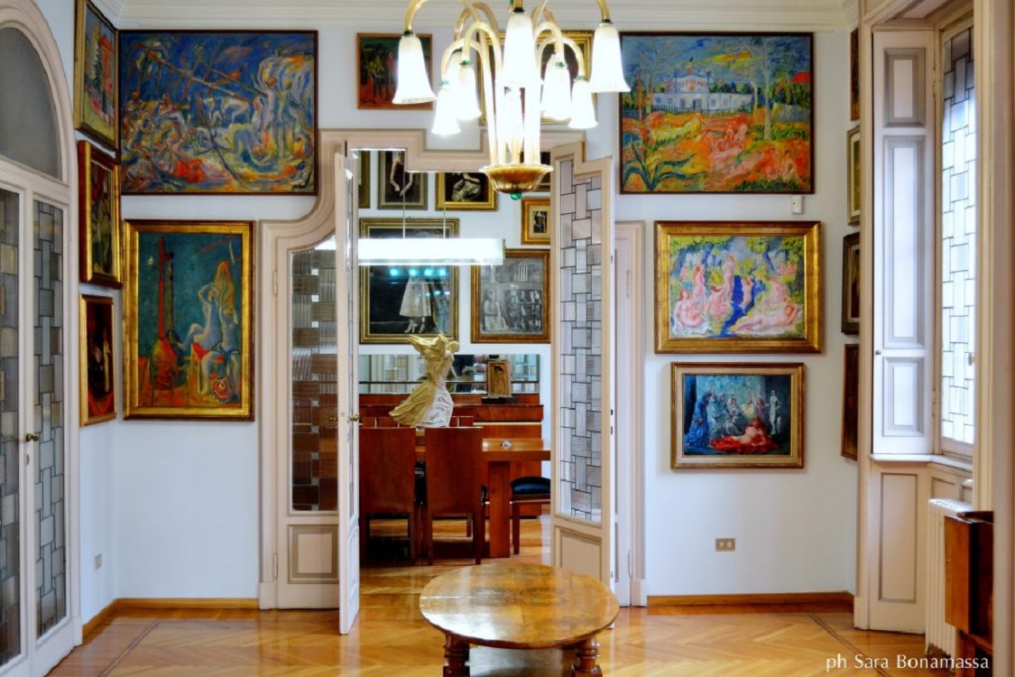 Il salone della casa museo, con il pianoforte originale ancora al centro della sala, è dedicato alla Scuola di Parigi e comprende La scuola dei gladiatori (1928) e i Facitori di trofei (1926-28) di Giorgio De Chirico, l’Annunciazione di Alberto Savinio (1932), opera simbolo della Casa Museo, e tele di Campigli, Paresce, Mafai. Superato il corridoio dedicato ai chiaristi, segue la sala monografica dedicata a Fontana. Oltre a due dei celebri “tagli” (Concetto SpazialeAttesa, 1959 circa) la Casa Museo conserva anche sculture in ceramica. Segue una sala dedicata ad artisti postcubisti (Moreni, Giunni, Brindisi, Piccoli), spazialisti (Crippa) e nucleari (Dangelo, Baj e Dova). L’ultima stanza è dedicata all’Informale, con un’opera, fra le altre, di Emilio Vedova (Immagine del tempo, 1953), due di Piero Manzoni (Rettangolo e Ipotesi prima. Rettangolo interrotto, 1958).