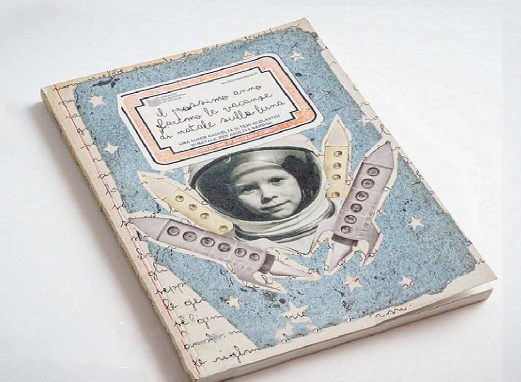 “Il prossimo anno faremo le vacanze di natale sulla luna”, edito dalla cartiera ecosostenibile Arbos (società benefit certificata B-Corp, da sempre vicina all’Archivio) è un raffinato volumetto stampato su carta riciclata, valorizzato da una grafica efficace ispirata proprio alla forgia d’un quaderno, tra semplicità e gusto retrò, a partire dalla copertina, che cuce in modalità collage l’etichetta di un vecchio notebook scolastico, sagome di razzi, il ritratto di un piccolo astronauta, un cielo stellato in punta di pastello e una paginetta scritta in corsivo. All’interno decine di temi e di lettere (con relativi disegni) dedicati al periodo di Natale, tutti provenienti dalla collezione dell’Archivio gestito dall’Associazione Quaderni Aperti, che nel 2019 la Soprintendenza archivistica e bibliografica della Lombardia ha definito “di interesse storico particolarmente importante”.