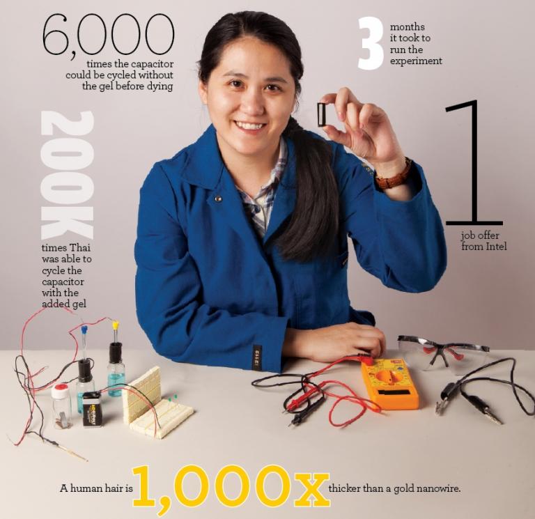 Mya, durante un’esperimento, ha deciso di rivestire i nanofili d’oro, con anidride di manganese e un gel elettrolitico simile al plexiglas. Dopodiché ha dato avvio a una serie di ciclii di ricarica (ovvero quando una batteria passa da scarica a completamente carica). Gli esperimenti sono continuati, tanto che è riuscita ad arrivare a 200.000 cicli in tre mesi. Tutto ciò indica che la vita di queste batterie è molto più lunga di quelle conosciute.