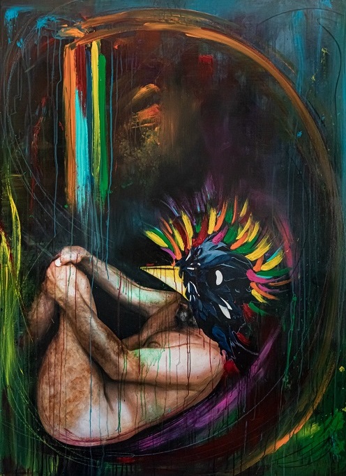 Kafka 9.0 è un racconto ciclico, una metamorfosi circolare che trasforma l’uomo in volatile e il volatile a sua volta in uomo. Da una forma all’altra emerge la consapevolezza, proprio come il protagonista della celebre opera kafkiana raggiunge la presa di coscienza solo dopo essere diventato animale. Per il soggetto di NINI questa catarsi è continua ed evolutiva: la metamorfosi è qui un viaggio positivo e di conquista, una ricerca della verità che diviene interpretazione complessiva. Il copricapo indossato dall’uomo delle statue vuole essere il segno distintivo del rituale di rinascita, il simbolo dell’aver trovato sé stessi.
