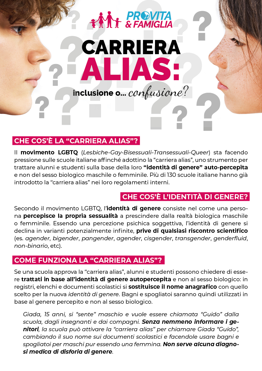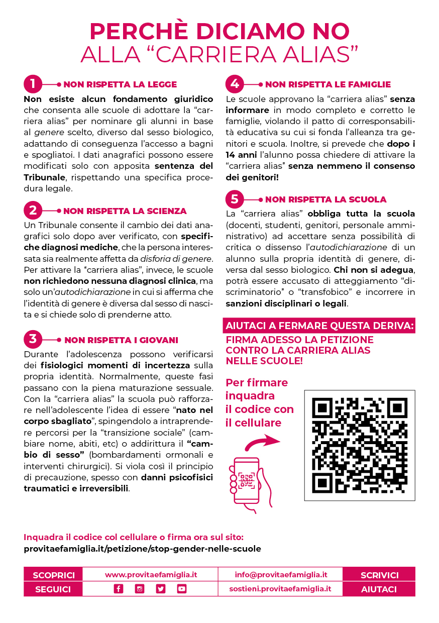 “Per motivi esclusivamente ideologici. La Carriera Alias è un modo per aderire (e obbligare tutti ad aderire) alla ideologia “gender”. Cioè l’ideologia per cui il sesso uno se lo sceglie nella testa e non è un dato oggettivo.